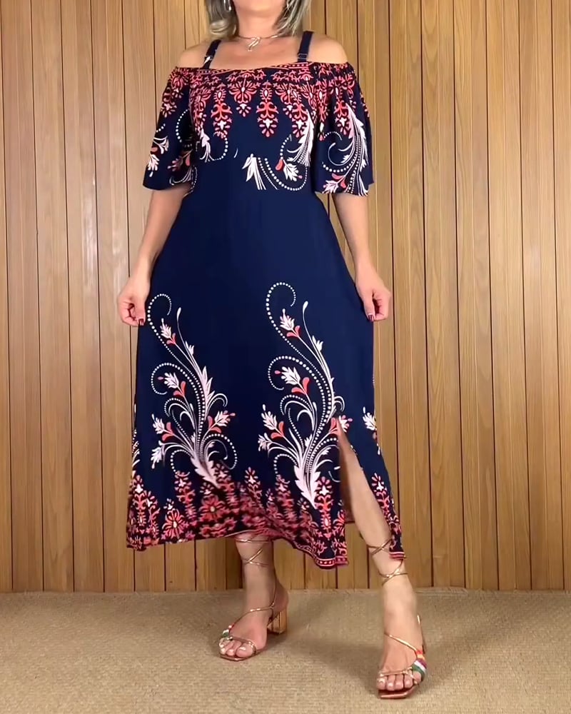 Off-Shoulder Short-Sleeved Printed Dress